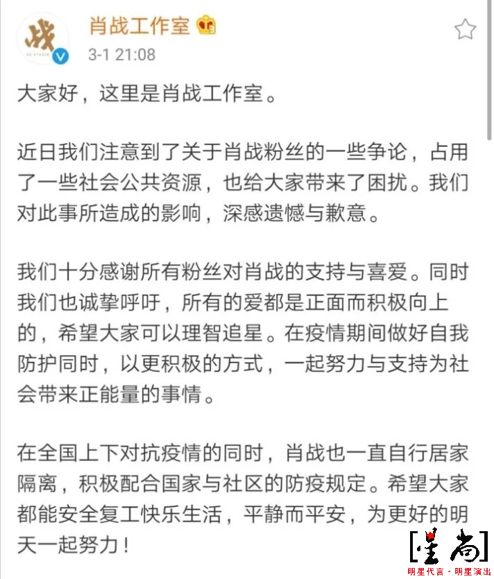 隨后,肖戰粉絲后援會(huì )也道歉,表示會(huì )誠摯呼吁大家理智追星,進(jìn)行內部反省和整改,傳播正面和積極的能量。肖戰的部分粉絲也開(kāi)始向大家道歉,為了挽回肖戰的路人緣,粉絲竭盡全力。同時(shí),又有男星力挺肖戰,還爆料肖戰的外公去世了,家里正在辦喪事,質(zhì)問(wèn)廣大網(wǎng)友良心是否會(huì )痛?