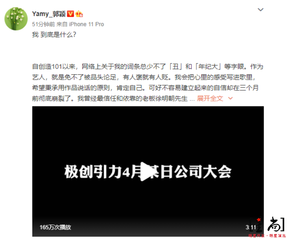 明星代言7月21日上午,前火箭少女101隊長(cháng)Yamy發(fā)文透露遭到公司惡語(yǔ)對待,并曝光了公司會(huì )議錄音,老板徐明朝在沒(méi)有Yamy參與的公司會(huì )議上對其外貌、能力等方面進(jìn)行人身攻擊。隨后前隊友楊超越、賴(lài)美云、Sunnee發(fā)聲力挺Yamy。