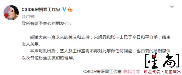 明星代言8月5日晚,宋妍霏工作室發(fā)文稱(chēng)宋妍霏和張一山已于今日和平分手,結束戀人關(guān)系。全文如下: